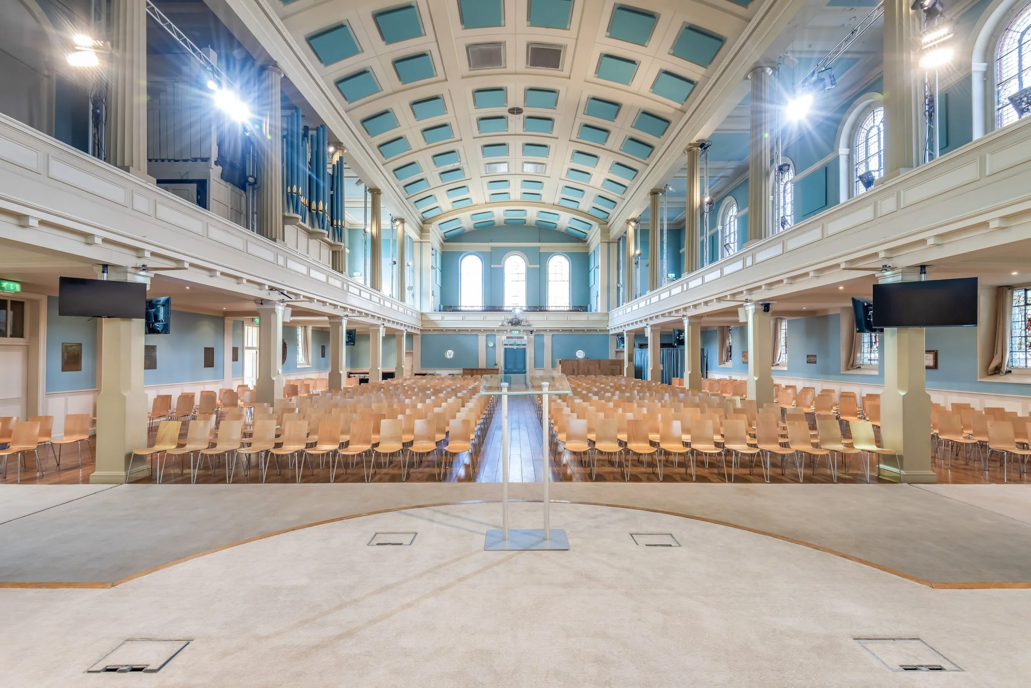 The Great Hall provides a dramatic plenary space with soaring ceilings, classical columns and natural light - an environment that elevates keynote speakers, strengthens leadership messages and creates a true sense of occasion for delegates. Unlike purpose-built venues designed for efficiency alone, St Mary’s delivers atmosphere and impact alongside professional conference functionality.